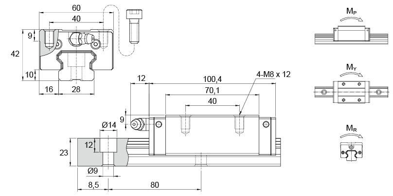 | Dinâmica (kgf) | Estática (kgf) | MP (kgf.m) | MY (kgf.m) | MR (kgf.m) | Carro kg | Guia kg/m | |