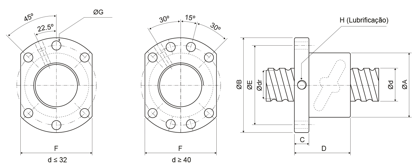 Capacidade de Carga ( Kgf ) | Dimensões da Porca | Diâmetro do Fuso | Passo |